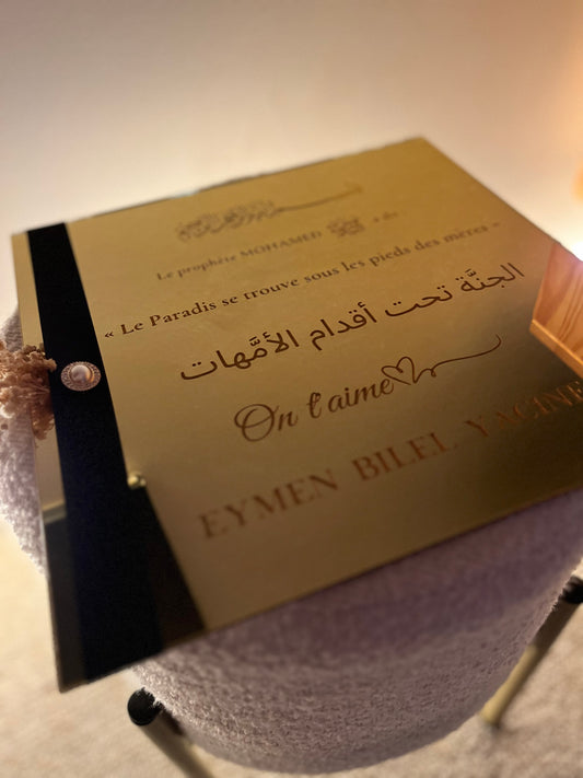 cadres de prières personnalisés, tapis de prière , boîtes à souvenirs religieuses… Nos pièces en bois, tissu ou papier sont personnalisables avec un prénom, une date, un verset ou une intention.