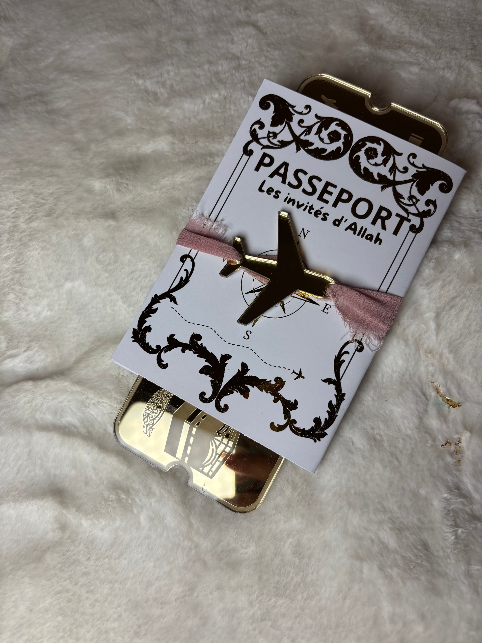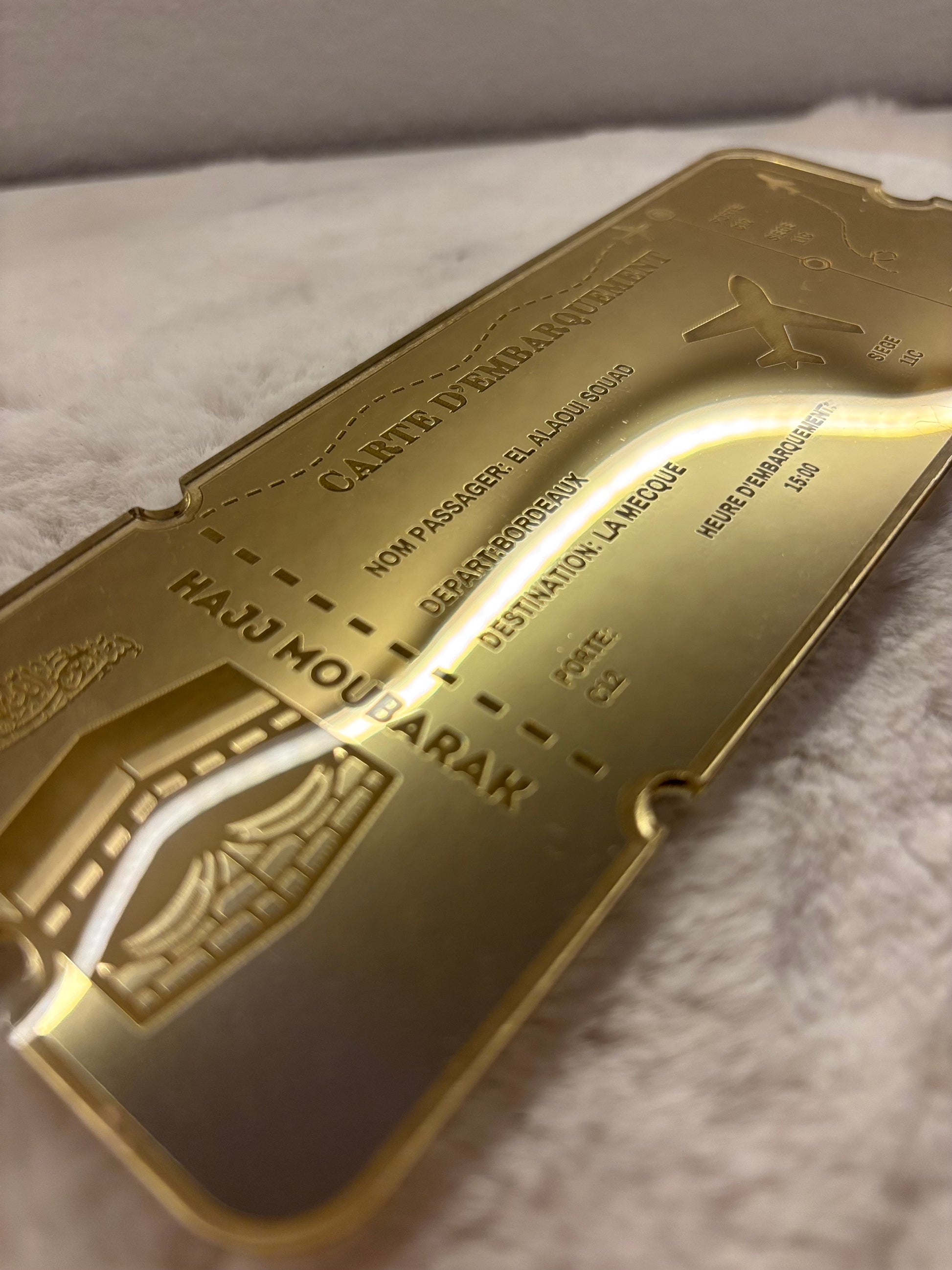 Ce billet d’avion en plexi or gravé est une création raffinée, parfaite pour offrir avant une Omra ou un Hajj.