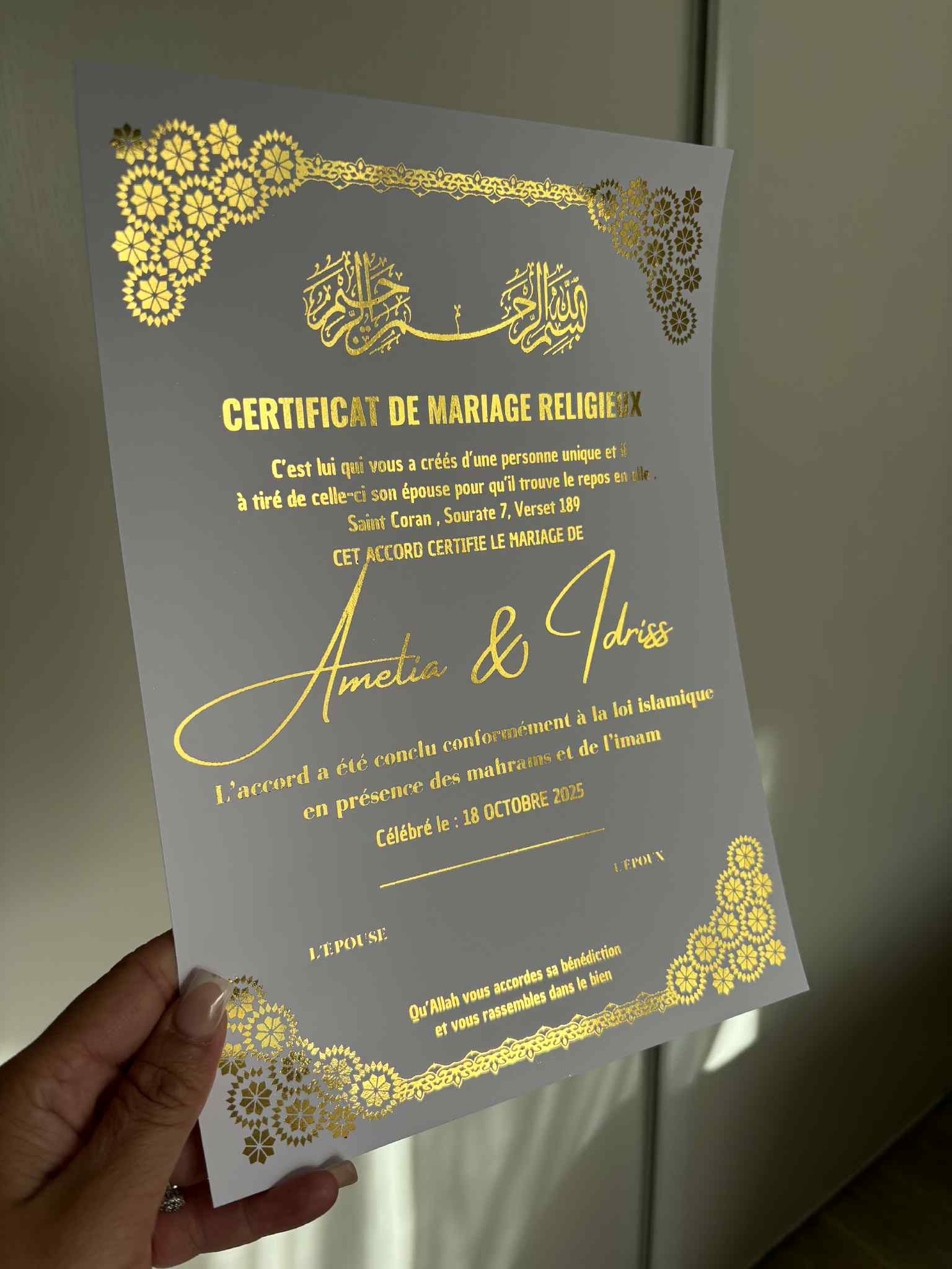 Un souvenir unique et raffiné : ce certificat de mariage est sublimé par de délicates touches de dorure, qui lui apportent élégance et éclat. Idéal à offrir en cadeau souvenir aux mariés, il deviendra un précieux témoignage de leur union, à conserver et admirer au fil du temps.