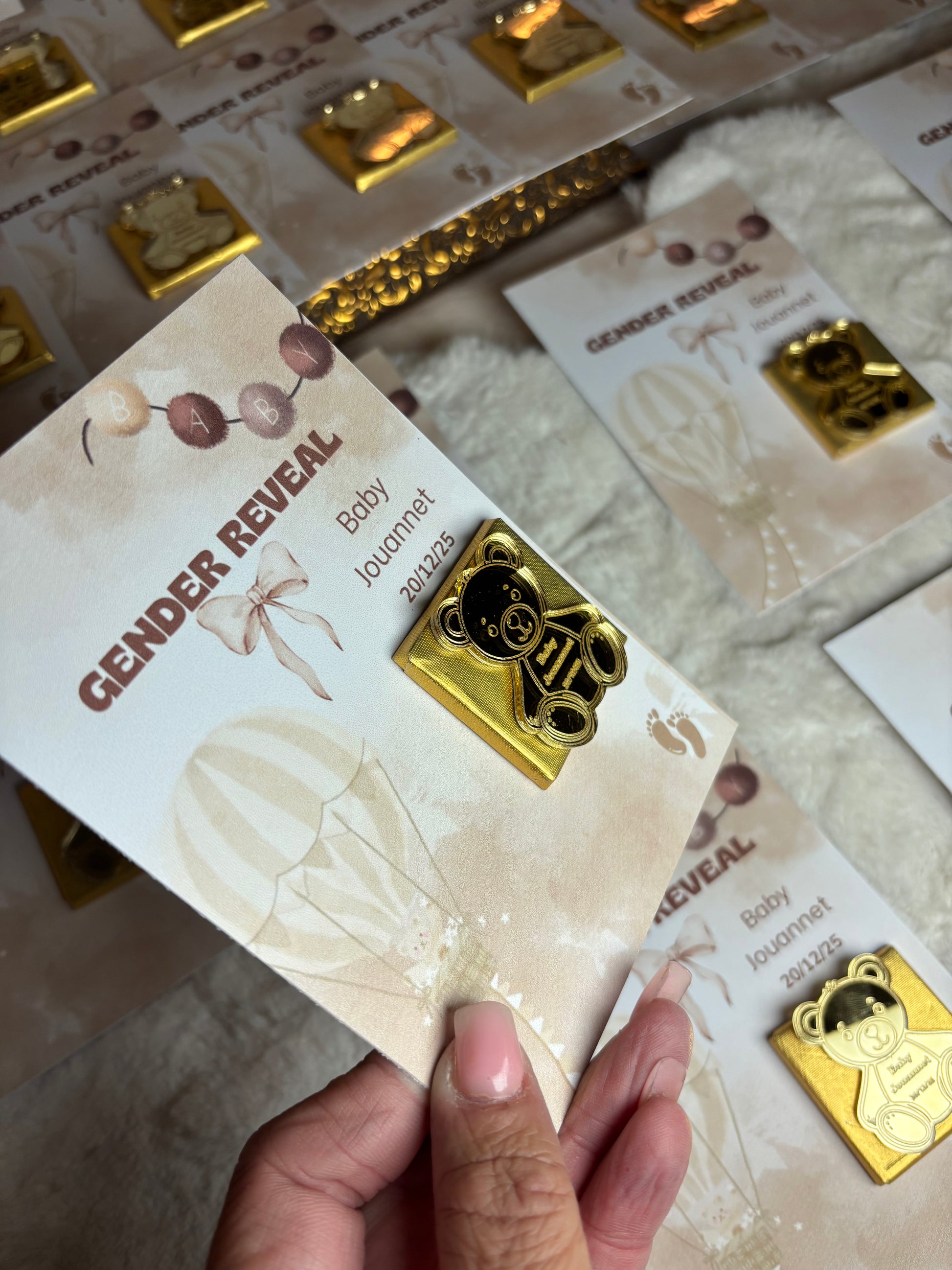 Lot de 10 cartes Gender Reveal avec chocolat et plexis nounours personnalisés